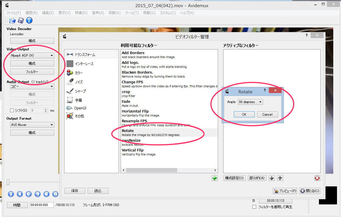 Copy  を Mpeg4 ASP(ff)  に変更します。次にフィルターをクリックしトランスフォームRotate を選択し、Angle を90degrees を選択します。