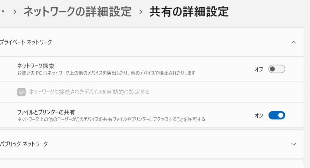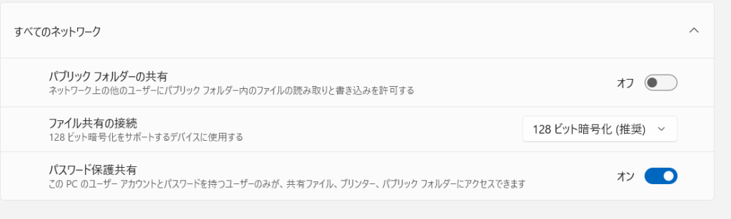 すべてのネットワーク を開き パブリックフォルダーの共有を オフ パス保護共有を オン に設定する