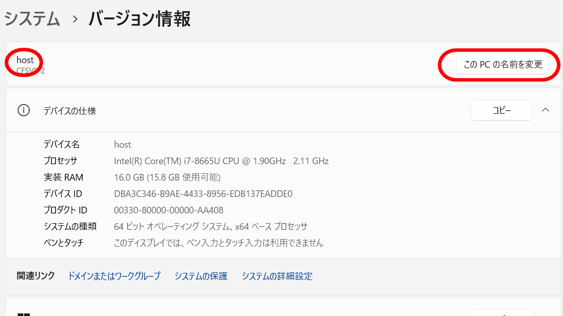 に移動し、ここでパソコンの名前の確認をしておきます。