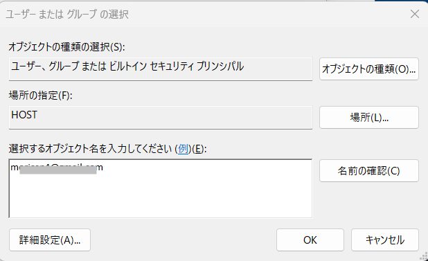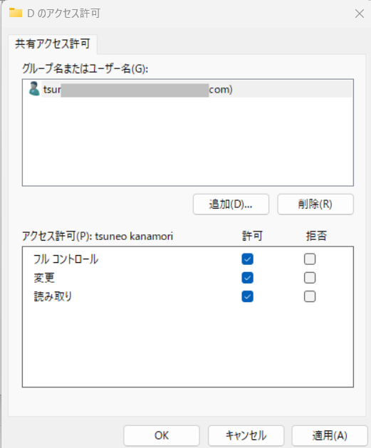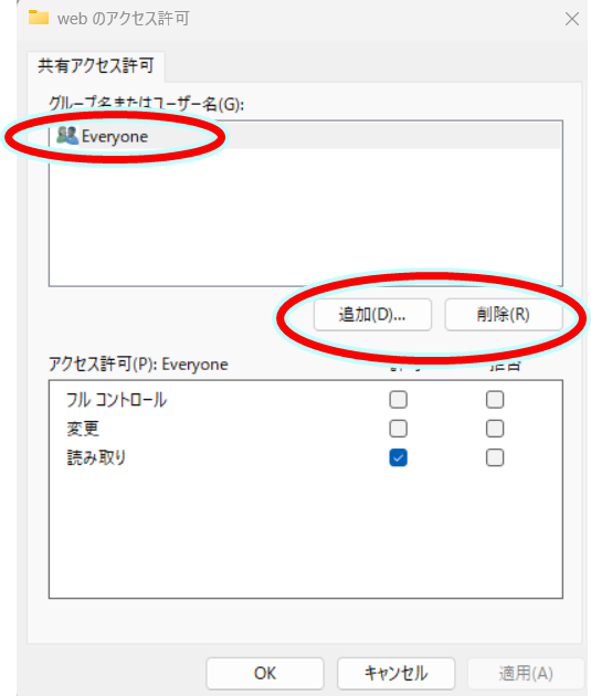 Everyoneを削除し、アクセスするパソコンのアカウントを入れます。