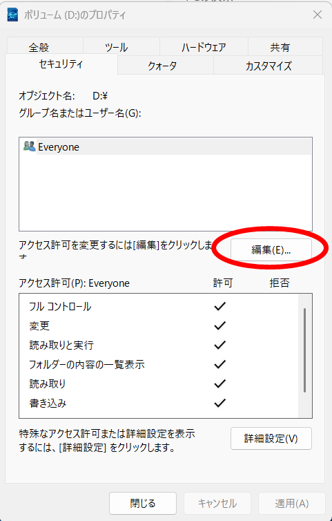 次にセキュリティの設定をします。プロパティのセキュリティタブを開き、編集をクリックします。
