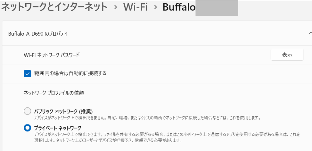 設定 ネットーワークとインターネット > WiFi > Wifiアダプターのプロパティ
