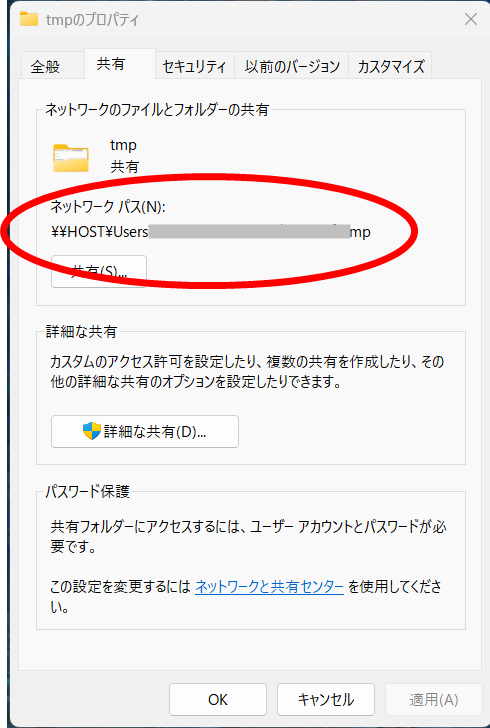 共有するドライブのプロパティを開き、 共有タブを開き詳細な共有 をクリックします。