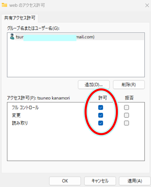 このフォルダを共有するにチェックを入れ、アクセス許可をクリックします。