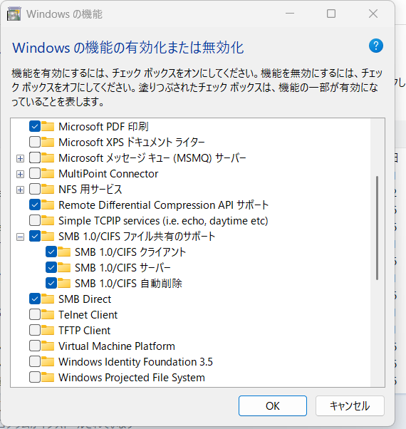 SMB 1.0 にチェックを入れ、SMBを有効にしました。