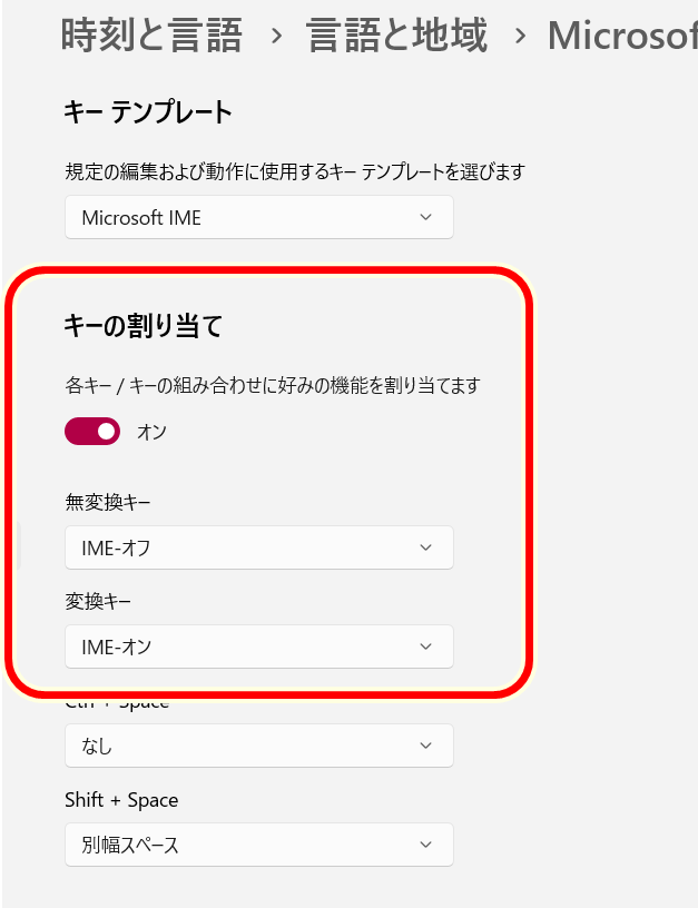 時刻と言語 > 言語と地域 > Microsoft IME > キーとタッチのカスタマイズ