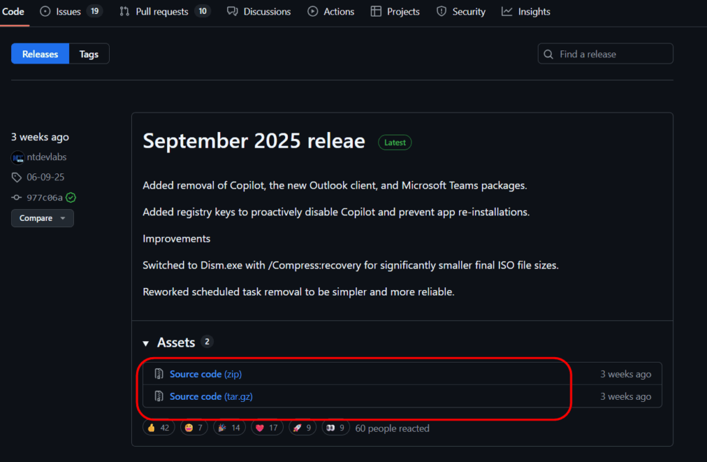 Source code(zip) をダウンロードして展開すると、Win11 25H2 用の tyny11 builder がダウンロードできます。