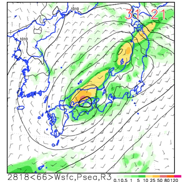これによると、日本海を通過する低気圧からのびる、寒冷前線が通過するような予想です。その後、弱い冬型気圧配置ですが、すぐ天気は回復するようです。