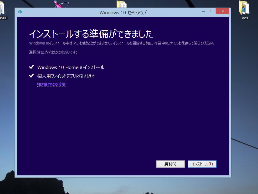 Win10のアップグレードを、早くから予約していたのですが、待てど暮らせどインストールができる「準備ができました」というメッセージが届かないので、アップグレードソフトをダウンロードしてインストールすることにしました。