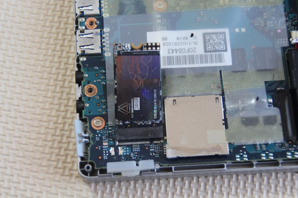 裏ブタが外れると左下の方に SSD が見えます。SSDの下に黒いシートが張ってありますが放熱用のシートのようです。