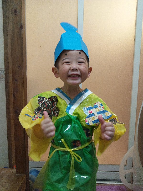 つよぴ~は、今月4才になります。誕生日は、なんと3月11日です。  (ちなみに家内は1月17日です)昨日は、保育園で誕生会があったそうです。その時の衣装がこれだそうです。下の方にブラブラしているものが付いていたのですが写ってなくてよかったで...