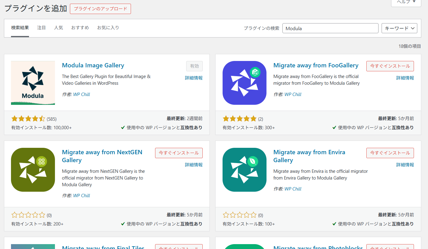 WordPress の無料ギャラリープラグイン「Modula」を使ってみました。設置は簡単で、写真の掲載も簡単にできました。結構、格好良く表示してくれます。プラグインのインストールプラグインの追加で Modula で検索すると、トップに出て...